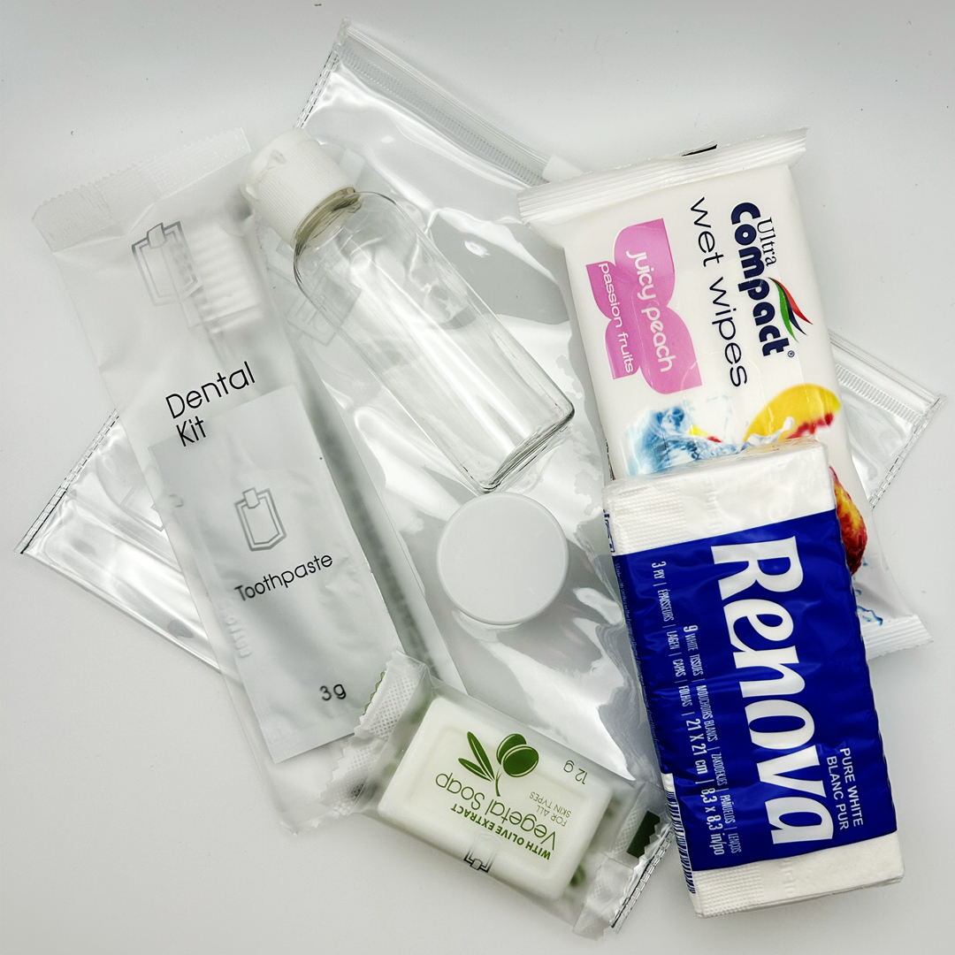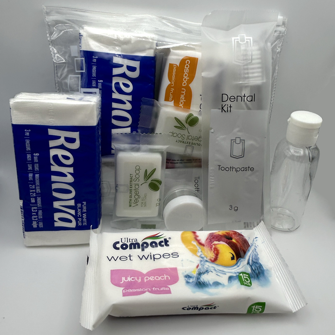 Escova de dentes (x1) Frasco para creme (x1) Frasco para líquido 40ml (x1) Toalhetes de limpeza húmidos (x1) Sabonete individual (x1) Conjunto Lenços de papel (x1) Bolsa de transporte (x1)