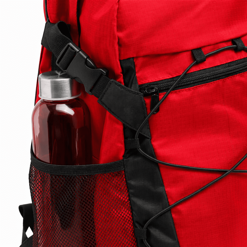 • Conta ainda com um compartimento frontal com cordão elástico e bolsos laterais em rede.